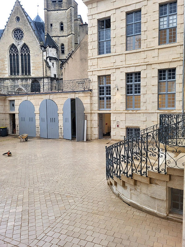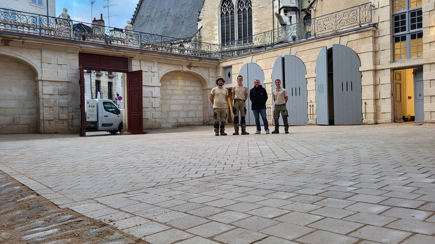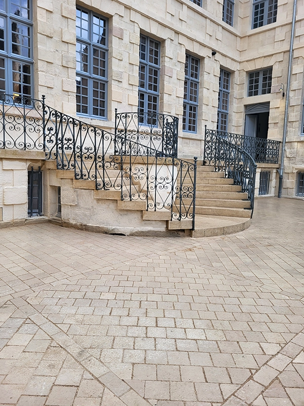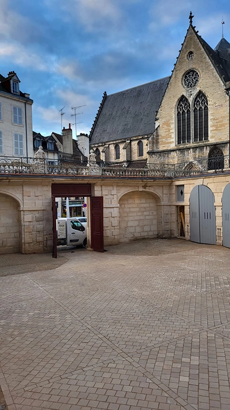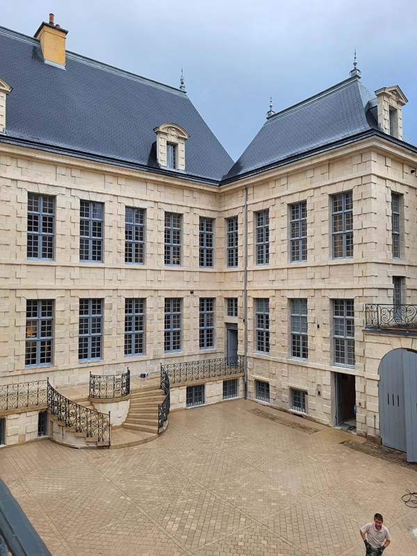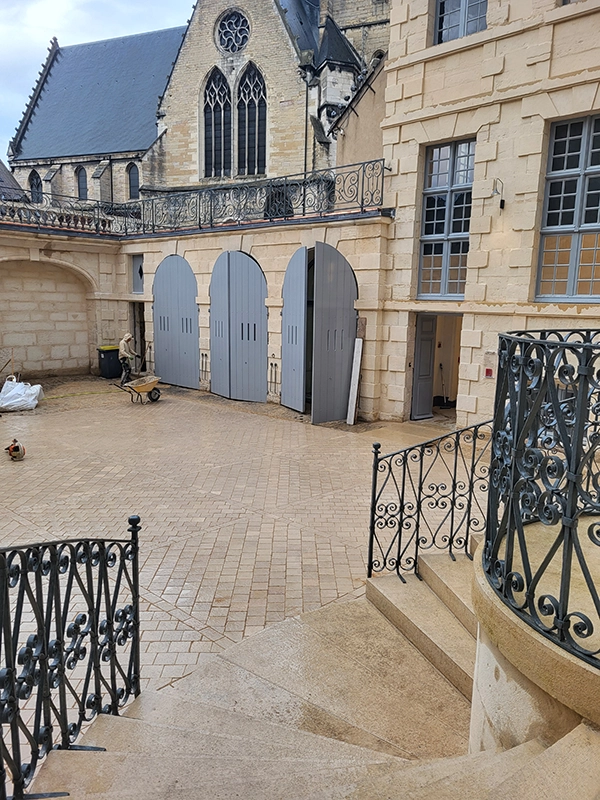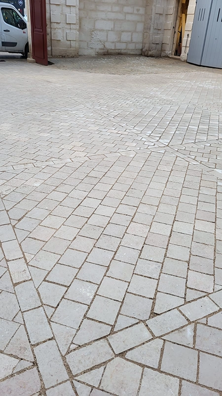 Notre intervention a consisté à la pose de pavés en pierre de Comblanchien, suivant un calepinage sur mesure, directement inspiré des motifs de marqueterie présents à l’intérieur du bâtiment. L’objectif étant d’assurer une continuité esthétique entre patrimoine bâti et aménagement extérieur.
