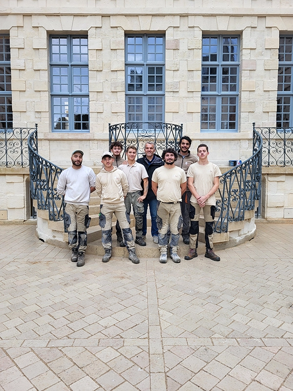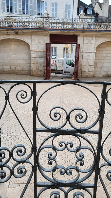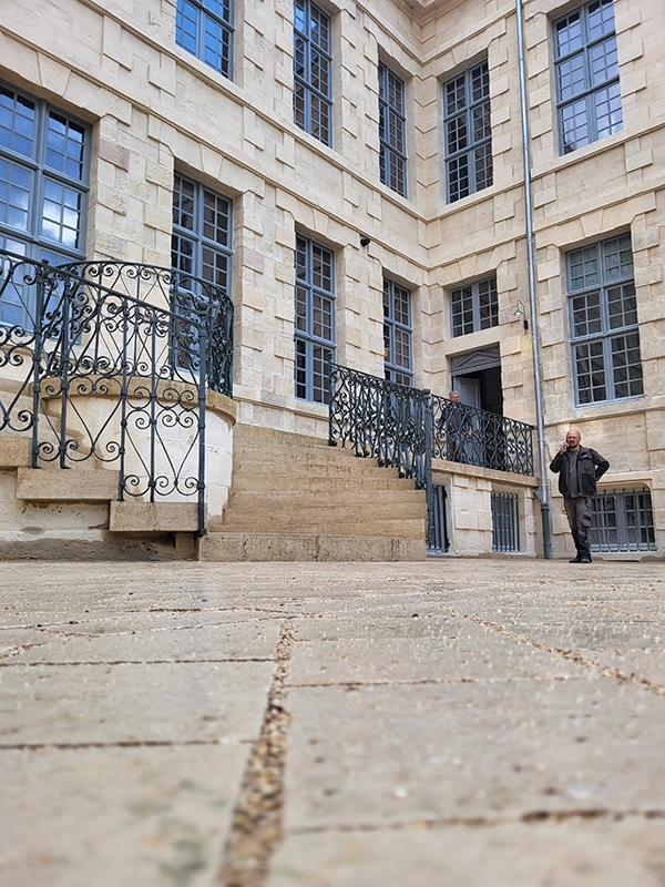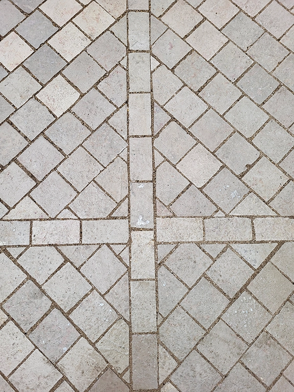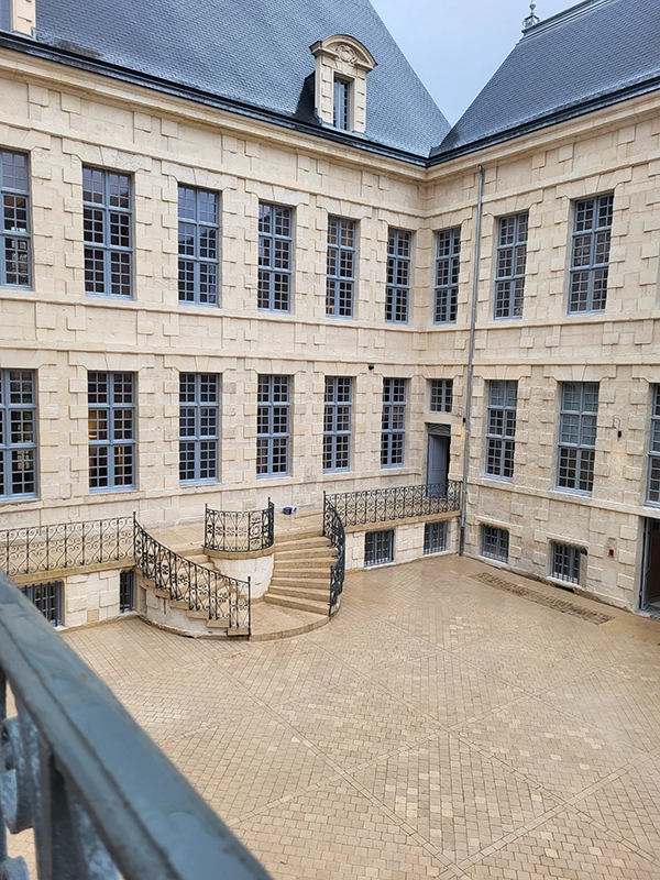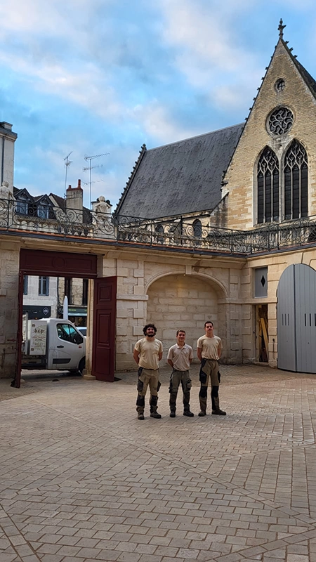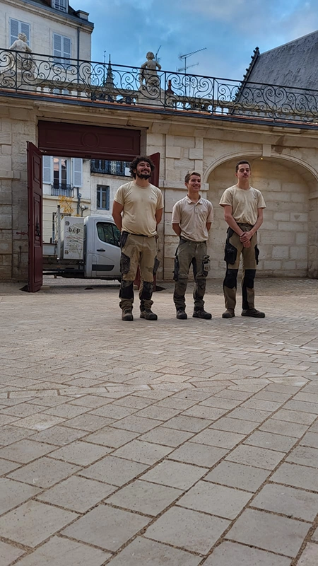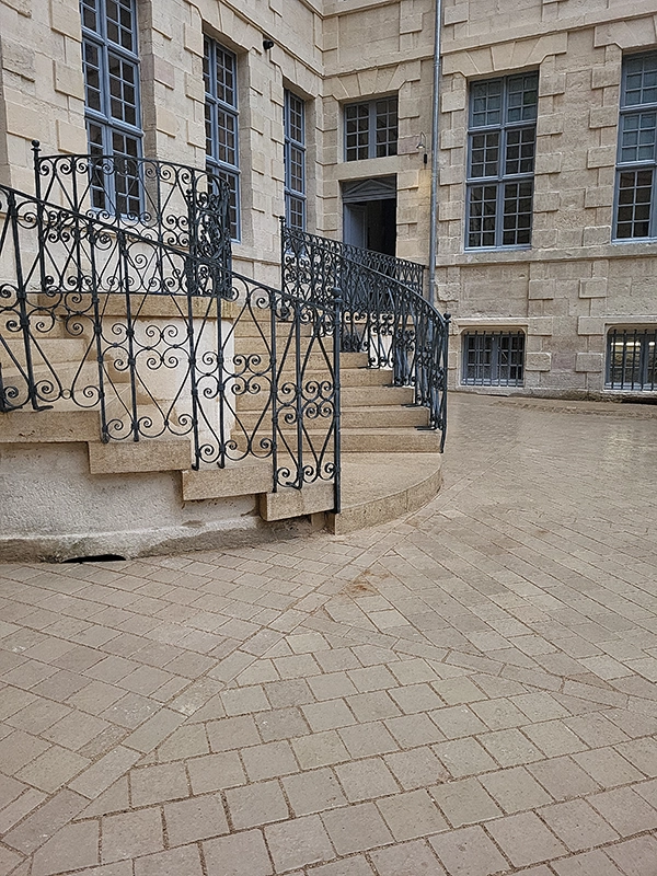 Notre intervention a consisté à la pose de pavés en pierre de Comblanchien, suivant un calepinage sur mesure, directement inspiré des motifs de marqueterie présents à l’intérieur du bâtiment. L’objectif étant d’assurer une continuité esthétique entre patrimoine bâti et aménagement extérieur.
