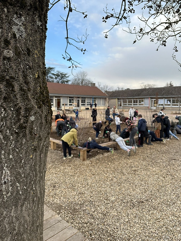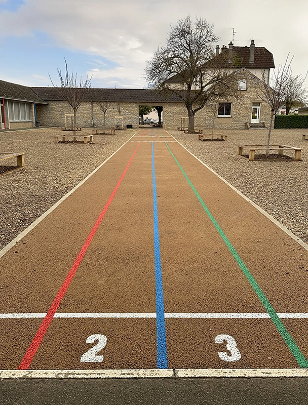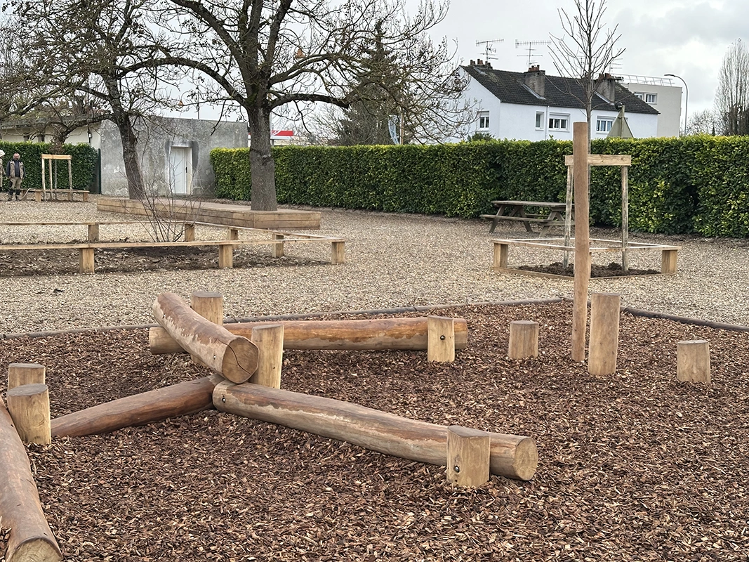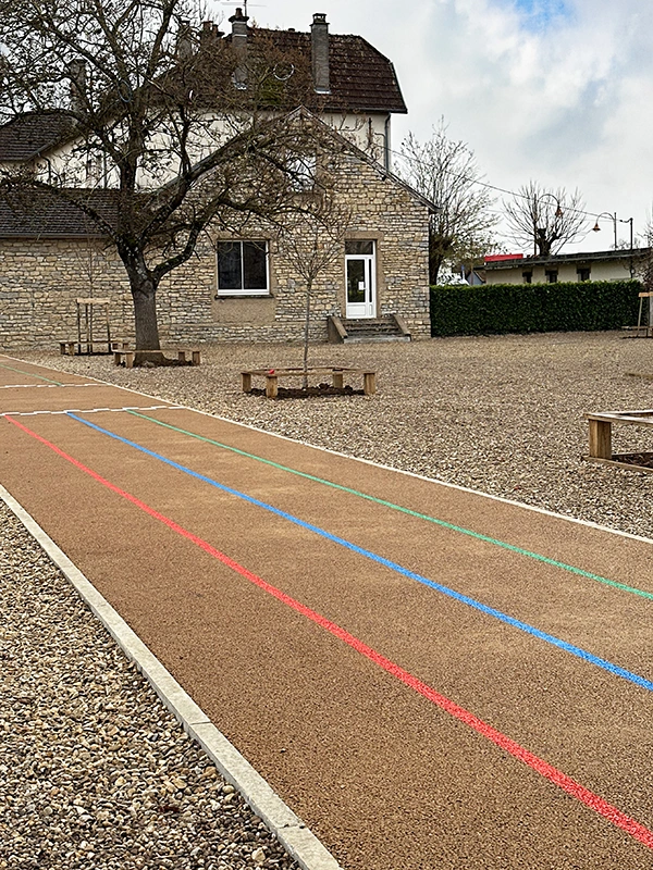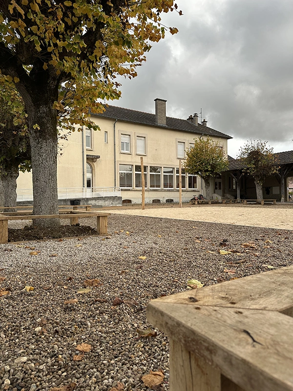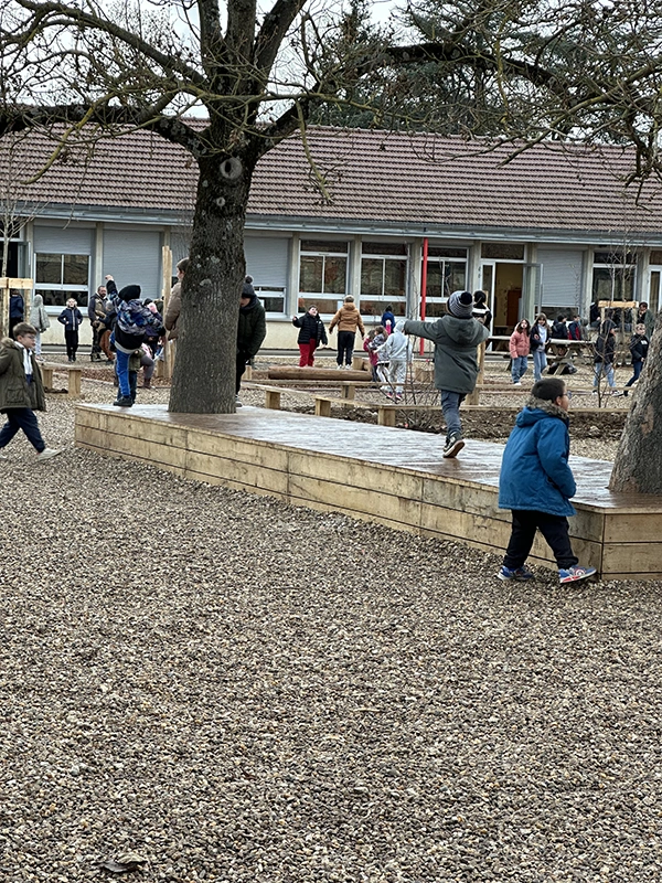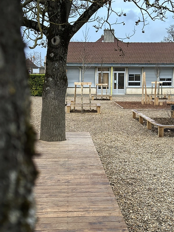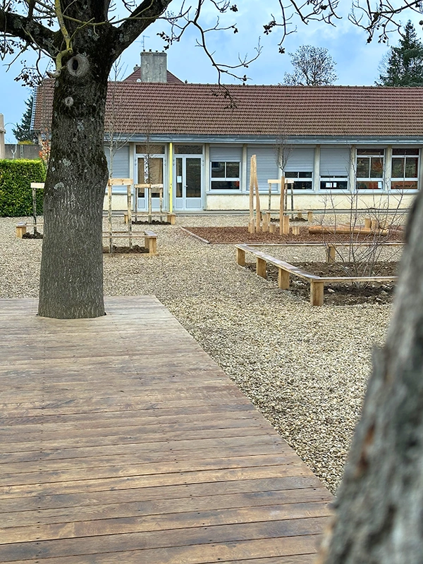 L’ouvrage consiste à retravailler la gestion des eaux pluviales en installant des revêtements drainants et biosourcés. L’aménagement intègre des zones végétalisées créant des îlots de fraîcheur, des espaces ludiques au sol, un terrain d’aventure en bois, ainsi qu’une zone potagère pour l’éducation au végétal. Le tout compose une cour plus respirante, durable et apaisée, optimisée pour le confort thermique et la vie scolaire.