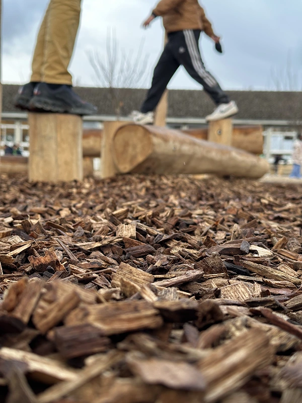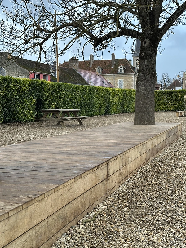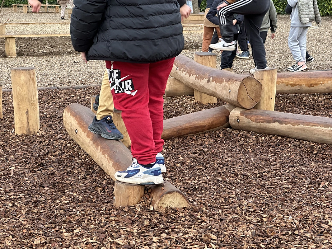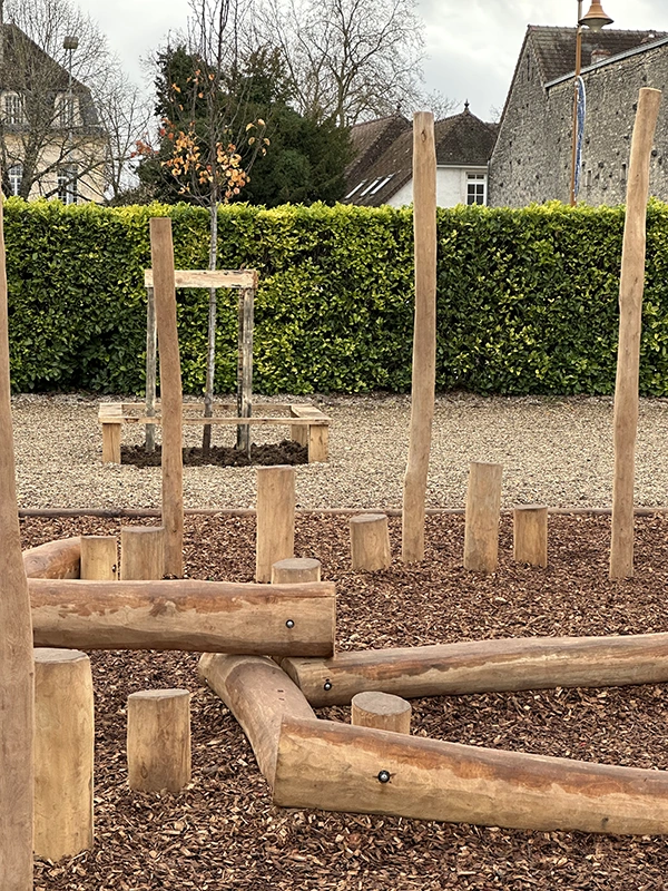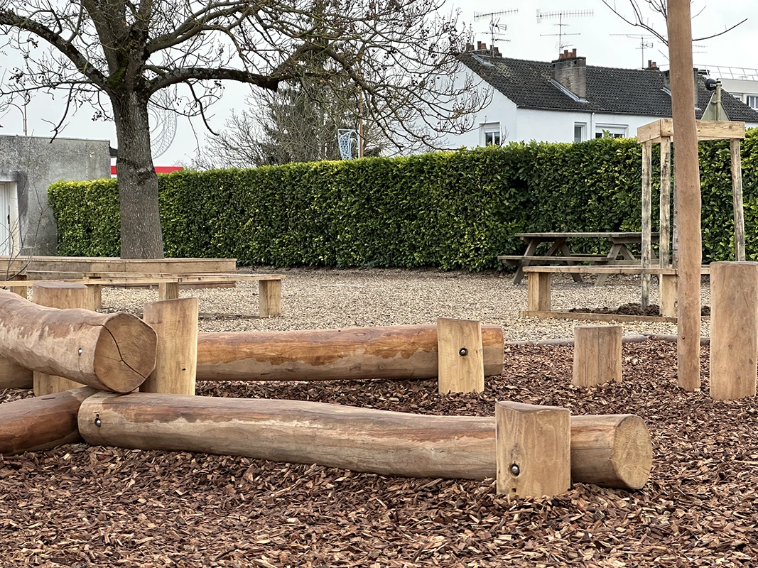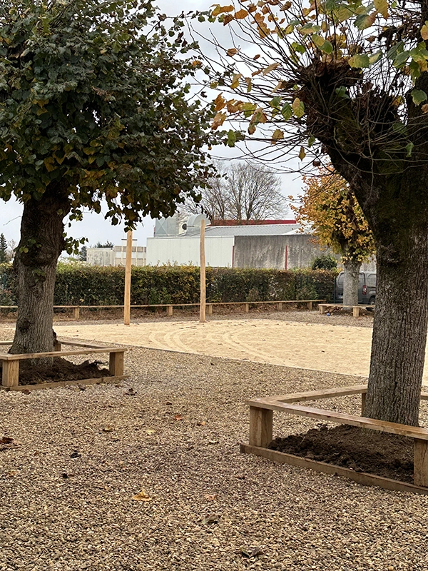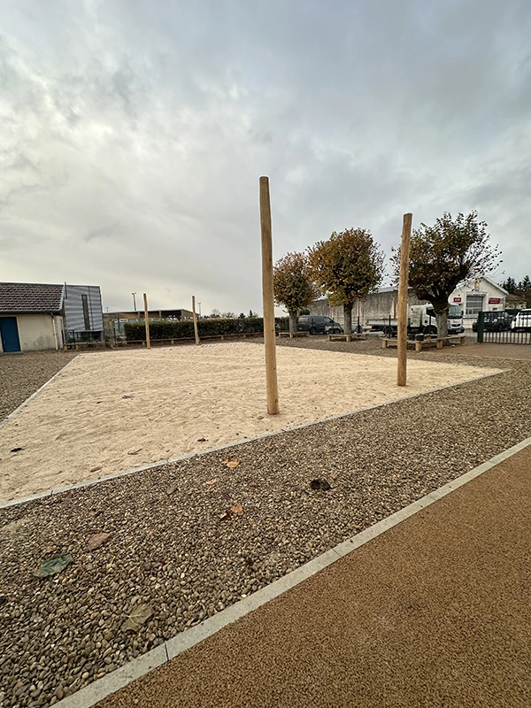 L’ouvrage consiste à retravailler la gestion des eaux pluviales en installant des revêtements drainants et biosourcés. L’aménagement intègre des zones végétalisées créant des îlots de fraîcheur, des espaces ludiques au sol, un terrain d’aventure en bois, ainsi qu’une zone potagère pour l’éducation au végétal. Le tout compose une cour plus respirante, durable et apaisée, optimisée pour le confort thermique et la vie scolaire.